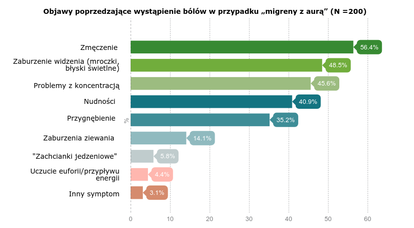 Tytułem dygresji wskazać należy, iż wśród składających się na ww. aurę czynników pozwalające przewidzieć napad migrenowy wyróżnić trzeba w głównej mierze uczucie zmęczenia – respondenci cierpiący na migrenę z aurą czynnik ten najczęściej wskazywali jako uprzedzający ich o nadejściu bólu (56,4% wskazań). Blisko połowa pytanych (48,5% wskazań) przed nastaniem migreny doświadcza zaburzenia widzenia (m.in. mroczki, przebłyski, zanik ostrości), a nieco mniej (45,6%) – miewa problemy z koncentracją. Jako inne przejawy aury podawano także m.in. nudności (40,9% wskazań) czy uczucie przygnębienia (35,2%). Jednostkowe wskazania dotyczyły natomiast takich objawów jak dla przykładu zawroty głowy, drętwienie kończyn czy uczucie ucisku w czaszce.