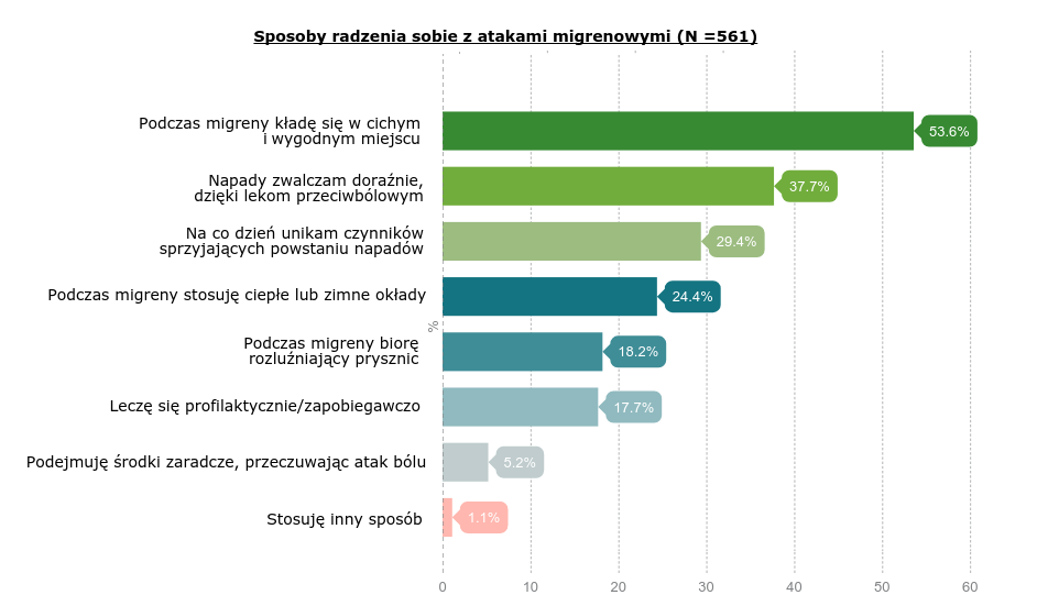 Jak każdy ból, także i migrenie można próbować zapobiegać, a jej napady – usiłować złagodzić. Stąd też doświadczających bólów migrenowych zapytani zostali także o ich sposoby radzenia sobie z tą dolegliwością. Jak się okazuje, ponad połowa pytanych (53,6% wskazań) próbuje łagodzić atak migrenowy kładąc się w cichym i wygodnym miejscu – jest to najczęstsza z praktykowanych metod. Po leki przeciwbólowe w takich sytuacjach sięga natomiast 2 na 5 pytanych (37,7% wskazań), praktycznie co czwarty pytany (24,4% wskazań) stosuje zimne lub ciepłe okłady, zaś co piąty (18,2%) – bierze rozluźniający prysznic. Wśród innych sposobów radzenia sobie z bólem ankietowani wymieniają m.in. próbę drzemki czy nawodnienia organizmu (pojedynczy respondenci sięgają po kawę z mlekiem, masaż, kojącą muzykę czy okłady ze spirytusu).