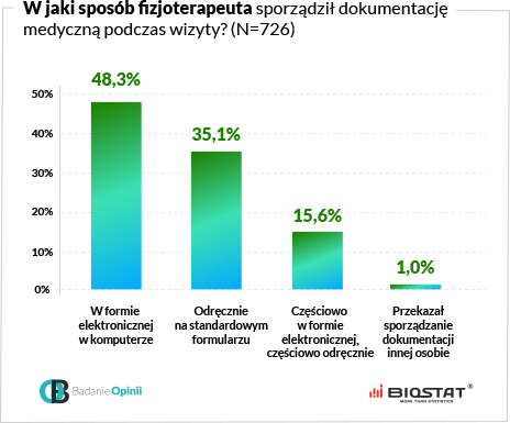 Dokumentacja medyczna nie została sporządzona w ponad 1/4 przypadków. Wśród pacjentów, w przypadku których fizjoterapeuta stworzył dokumentację medyczną, niemal połowa respondentów wskazała na formę elektroniczną (w komputerze). W sposób tradycyjny (na standardowym formularzu) dokumentację przygotowano u 35,1% pacjentów, zaś co szósty ankietowany wskazał na formę częściowo elektroniczną, a częściowo odręczną. Korzystanie z Elektronicznej Dokumentacji Medycznej (EDM) stanowi znaczące ułatwienie dla specjalistów, gdyż pozwala na przesyłanie dokumentacji pacjenta pomiędzy specjalistami, usprawniając tym samym proces diagnostyki, a następnie leczenia pacjenta.