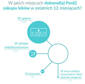 Zgodnie z wynikami badania ilościowego, najbardziej powszechnym miejscem zakupu leków w Polsce jest apteka. W ostatnim roku w aptece zaopatrywało się aż 97% respondentów. Mimo rosnącej tendencji do zakupów online, do zakupów leków przez Internet, skłonnych było zaledwie 7% badanych. Zdecydowana większość Polaków jest przekonana o tym, że zakup leków przez Internet jest mniej bezpieczny niż w aptece stacjonarnej – 73%. Nieco częściej leki były kupowane w sklepach wielobranżowych – 15% respondentów.