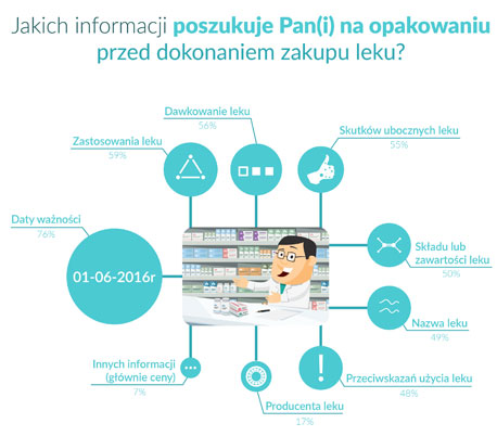Realizacja badania pozwoliła odpowiedzieć na pytanie, na jakie informacje zawarte na opakowaniu leku zwraca sie uwagę przed jego zakupem. Najczęściej poszukiwanym elementem opakowania leku jest data ważności– 76% wskazań. Nieco rzadziej respondenci poszukują informacji dotyczących zastosowania leku – 59%, dawkowania – 56%, skutków ubocznych – 55%. Dokładnie połowa badanych zwraca uwagę na skład leku podany na opakowaniu.istotności opakowań leków oraz poszczególnych ich elementów w procesie podejmowania decyzji o ich zakupie, przeprowadzono badanie ilościowe i jakościowe.