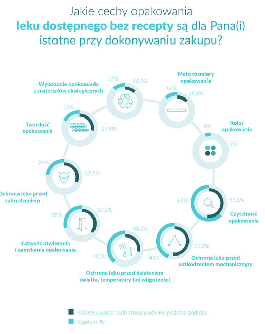 Czytelność opakowania to cecha uznawana przez respondentów za najistotniejszą w kontekście opakowań leków. Cecha ta została wskazana przez 62% badanych. Nieco rzadziej wskazywano na ochronę leku przed uszkodzeniem mechanicznym – 43% wskazań, a także ochronę leku przed działaniem światła, temperatury lub wilgoci – 41% wskazań.