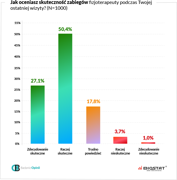 Ponad 3/4 pacjentów, którzy w ostatnim czasie skorzystali z pomocy fizjoterapeutów, pozytywnie wypowiedziało się o skuteczności zaproponowanego im rodzaju leczenia (Zdecydowanie skuteczne, Raczej skuteczne). Warto zaznaczyć, że zaledwie co dwudziesty ankietowany uznał metody zastosowane podczas ostatniej wizyty u fizjoterapeuty za nieskuteczne, a odsetek niezadowolonych pacjentów rośnie wraz z ich wiekiem.