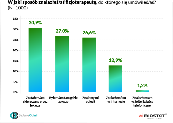 Polacy najczęściej udają się do fizjoterapeuty, do którego zostali skierowani przez lekarza – 30,9%. Co czwarty ankietowany udał się do fizjoterapeuty, z usług którego korzystał już wcześniej, co świadczy o zaufaniu jakim pacjenci ich obdarzają. Również ponad 1/4 respondentów wybrała gabinet fizjoterapeutyczny, który został im polecony przez znajomych. Na wybór fizjoterapeuty znalezionego w Internecie zdecydował się co ósmy badany.