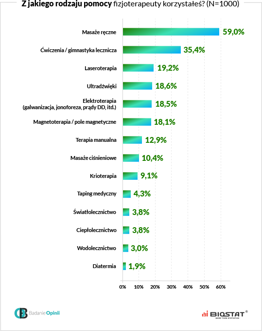 Fizjoterapia i rehabilitacja to nie synonimy, choć często są tak stosowane. Polacy wciąż nie rozróżniają tego z jakimi problemami mogą zwrócić się do fizjoterapeuty, a z jakimi do rehabilitanta. Ponad połowa badanych, podczas wizyty u fizjoterapeuty, skorzystała z masaży ręcznych, a ponad 1/3 odbyła ćwiczenia bądź gimnastykę leczniczą. Umiarkowaną popularnością cieszą się laseroterapia, terapia ultradźwiękami, elektroterapia, a także magnetoterapia – na każdą z tych terapii udał się niemal co piąty respondent.