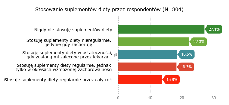 Pozostając w tematyce suplementów diety, do respondentów zwrócono się z zapytaniem o sposób, w jaki stosują produkty tego typu. Co istotne, większość zapytanych (27,2%) zadeklarowała, że nie korzysta z suplementów diety, zaś 22,4% - że sięga po nie nieregularnie i tylko w okresie zachorowań. Regularnie, przez cały rok, zażywa suplementy diety jedynie niespełna 14% badanych panelistów.