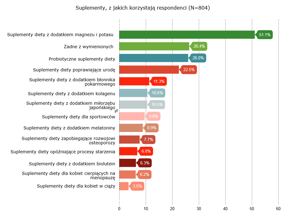 Jak dowiedziono już wcześniej, część badanych stosuje suplementy diety. Co warto podkreślić, ponad połowa respondentów stosuje suplementy z dodatkiem magnezu i potasu, zaś praktycznie, co czwarty pytany sięga po probiotyczne suplementy diety. Z kolei 22,5% zadeklarowało, iż preferuje te suplementy, które sprzyjają dbaniu o wygląd zewnętrzny.