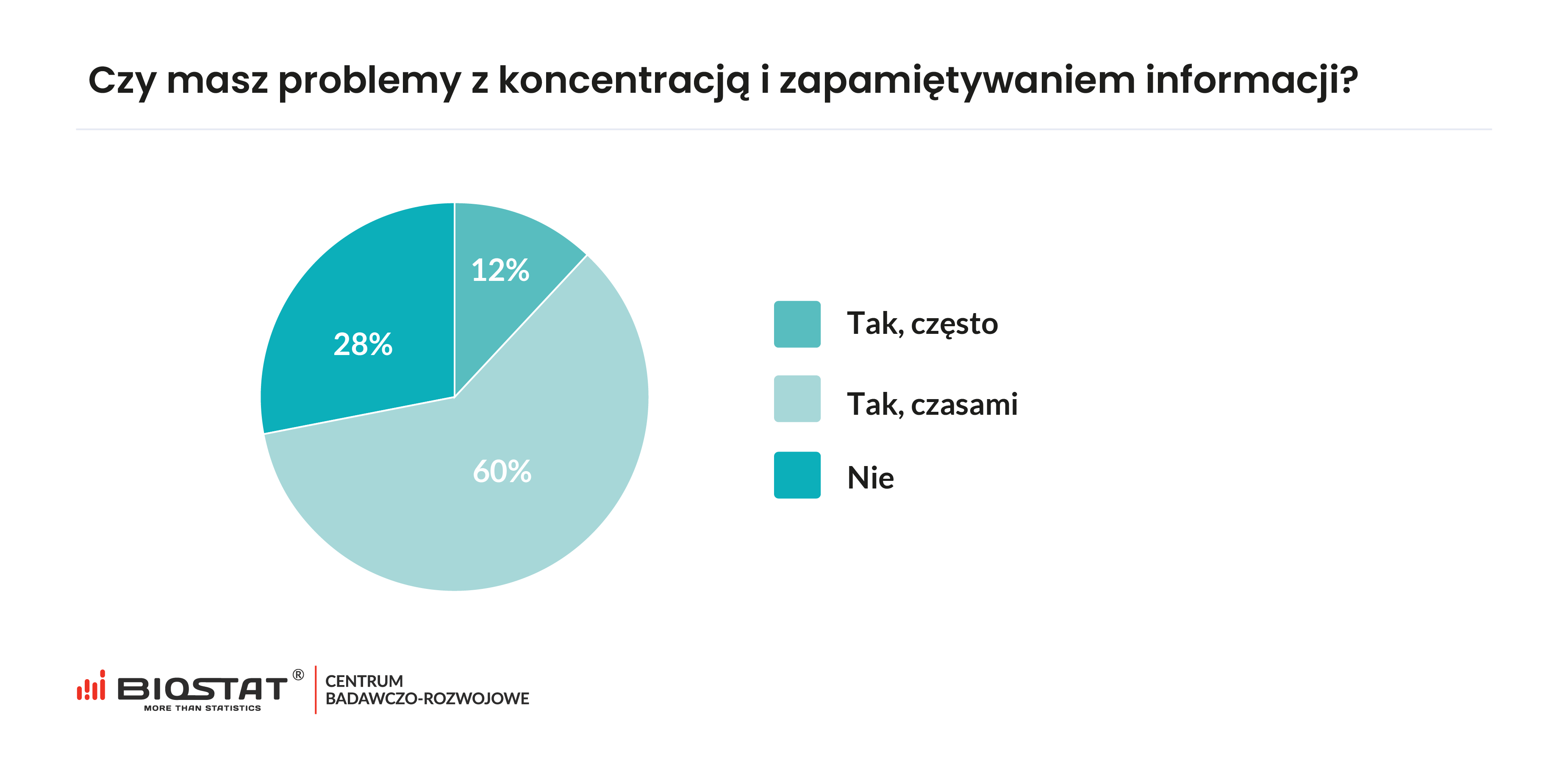 Do problemów z koncentracją i zapamiętywaniem informacji przyznaje się w sumie aż 71,6% Polaków. 59,6% miewa takie problemy czasami, natomiast 12% - często. Kłopotów z koncentracją i zapamiętywaniem nie zauważyło u siebie 28,4% pytanych.