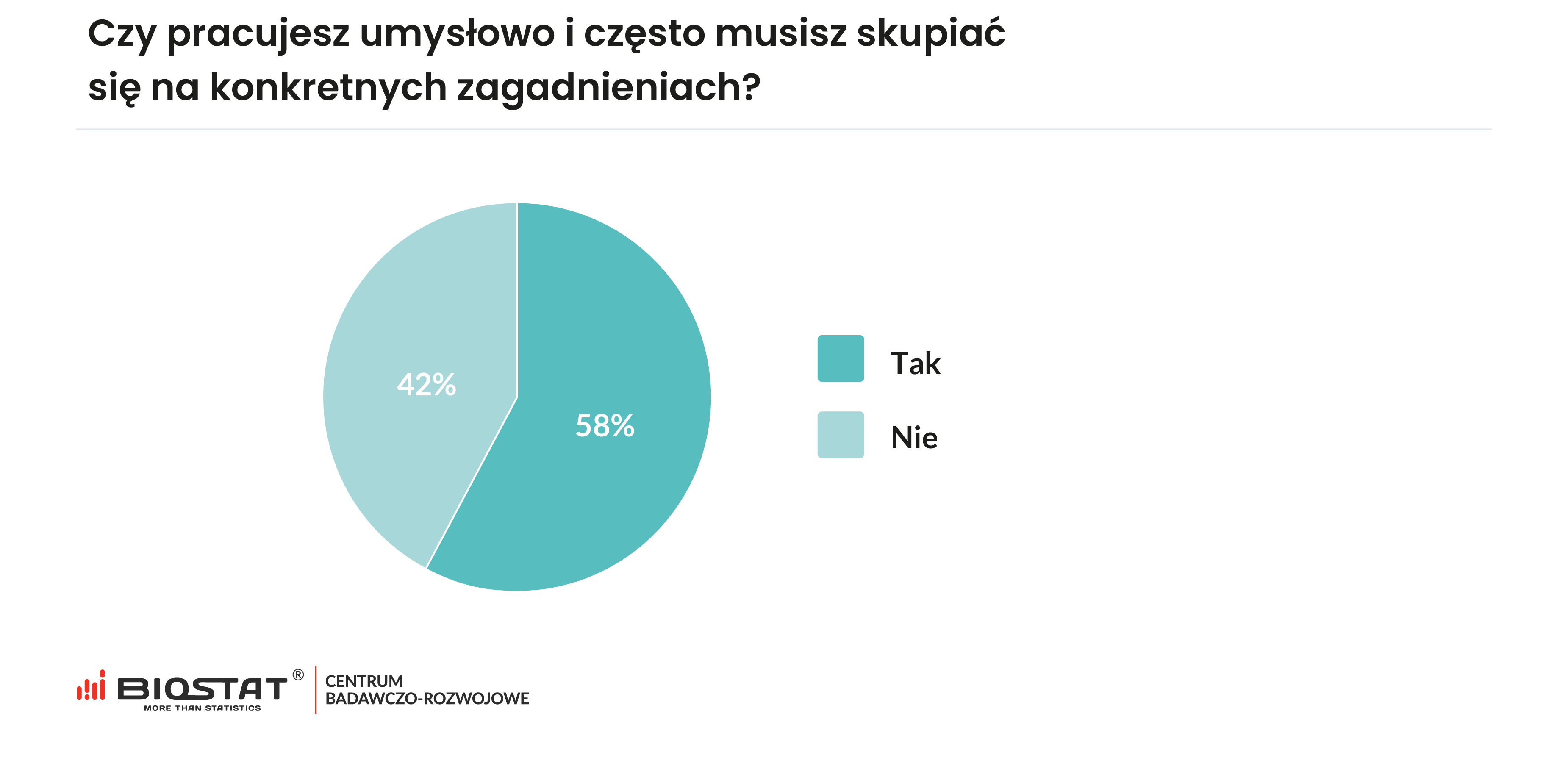 Wśród respondentów 58% pracuje umysłowo. Są to osoby, które często muszą skupiać się na konkretnych zagadnieniach. 42% uczestników sondażu nie pracuje umysłowo i nie musi często skupiać się na konkretnych zagadnieniach.