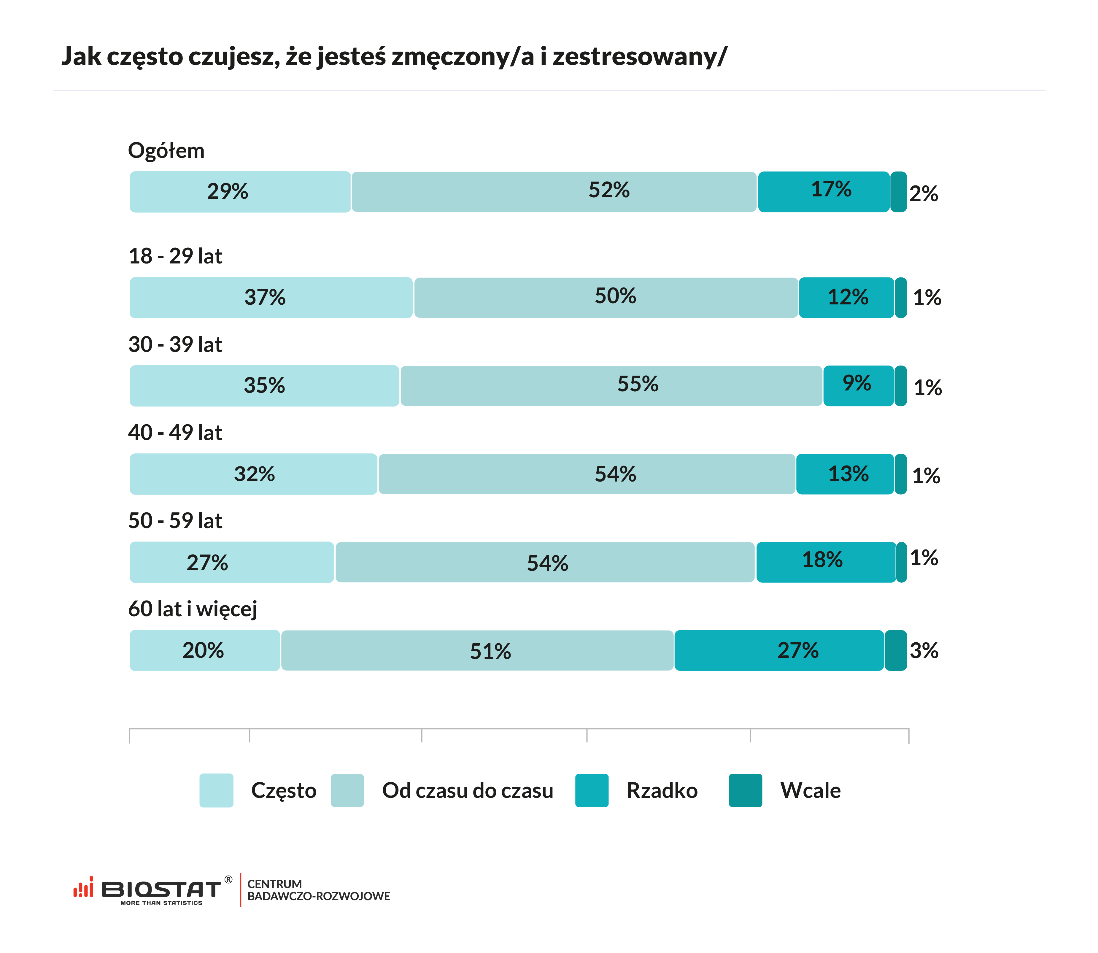 Zmęczenie i stres od czasu do czasu dotyka 52,5% Polaków. Jednak 28,7% mieszkańców naszego kraju jest zmęczonych i zestresowanych często. Rzadko zmęczenie i stres odczuwa 17,3% ankietowanych, a tylko 1,5% - wcale. Wyraźnie częściej niż deklarowana średnia dla badanej grupy respondentów na częste zmęczenie i zestresowanie narzekają osoby młodsze, w szczególności w wieku od 18 do 29 lat (36,7%), a także od 30 do 39 lat (35%) oraz od 40 do 49 lat (32,2%). Stosunkowo najmniej zestresowaną grupę stanowią osoby w wieku powyżej 60 lat (26,8% deklaruje, że rzadko jest zmęczona i zestresowana).