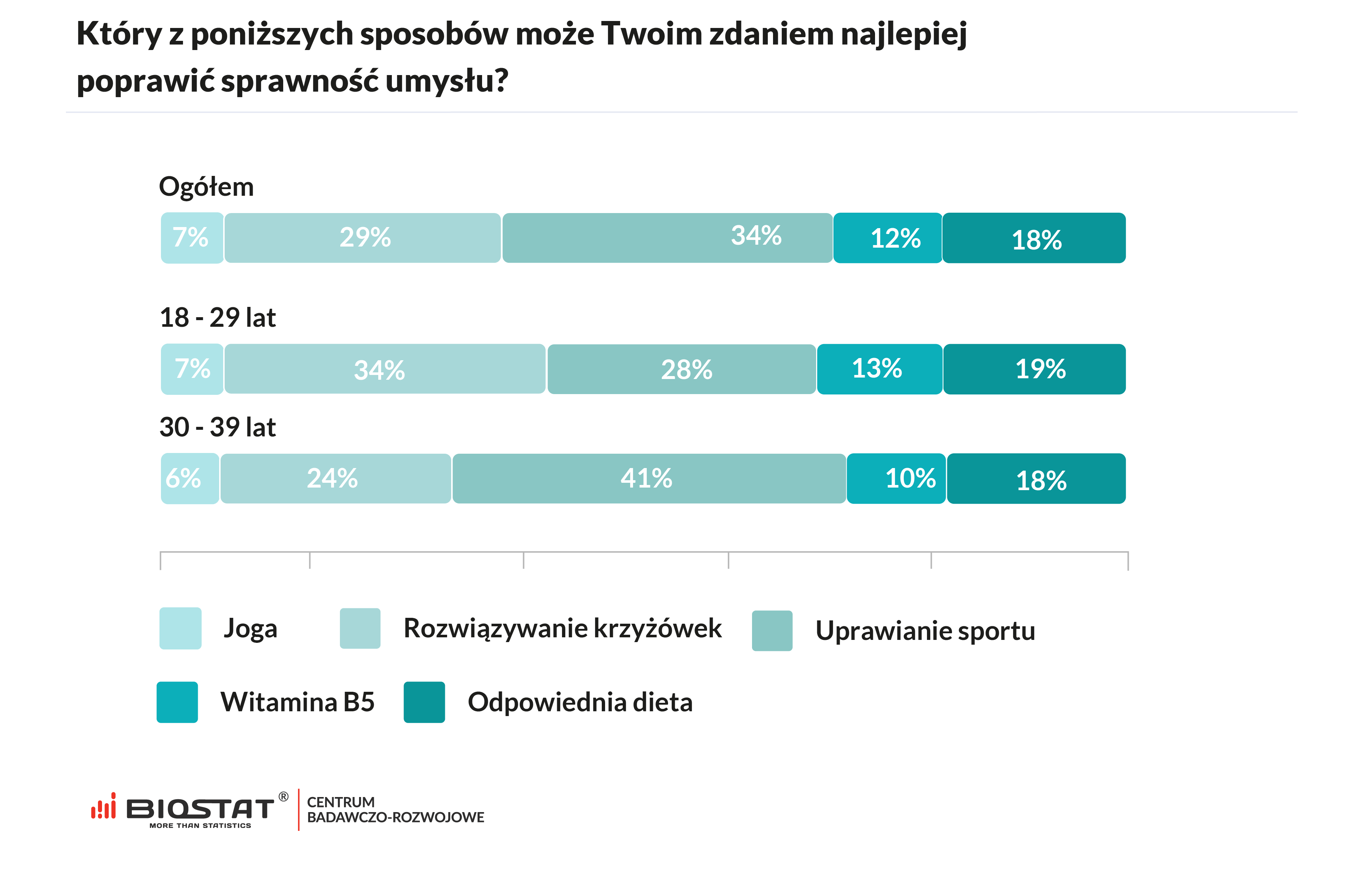 Zapytani o to, w jaki sposób najlepiej poprawić sprawność umysłu, uczestnicy sondażu w pierwszej kolejności wskazali na uprawienie sportu (34,2% wskazań), następnie rozwiązywanie krzyżówek (29,2%). Znaczenie odpowiedniej diety dla sprawności umysłu docenia 18,% respondentów, zaś przyjmowanie witamin za najlepszy sposób poprawienia sprawności umysłu uznało 11,5% ankietowanych. Z jogi korzysta w tym celu tylko 6,6% pytanych. Co ciekawe, na rolę sportu w utrzymaniu sprawności umysłowej częściej wskazują mężczyźni (40,9%) niż kobiety (28,1%). Z kolei rozwiązywanie krzyżówek jest wyraźnie popularniejsze u kobiet (33,6% wskazań) niż u mężczyzn (24,4%).