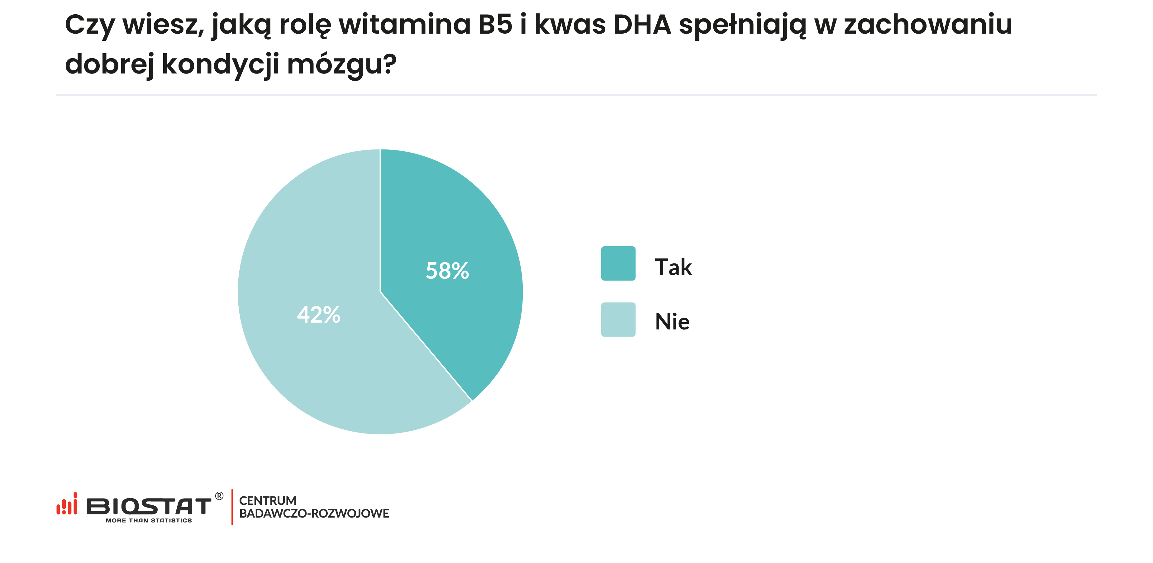 61,2% uczestników sondażu nie wie, jaką rolę spełniają witamina B5 i kwas DHA w zachowaniu dobrej kondycji mózgu. Wiedzę taką deklaruje 38,8% pytanych.